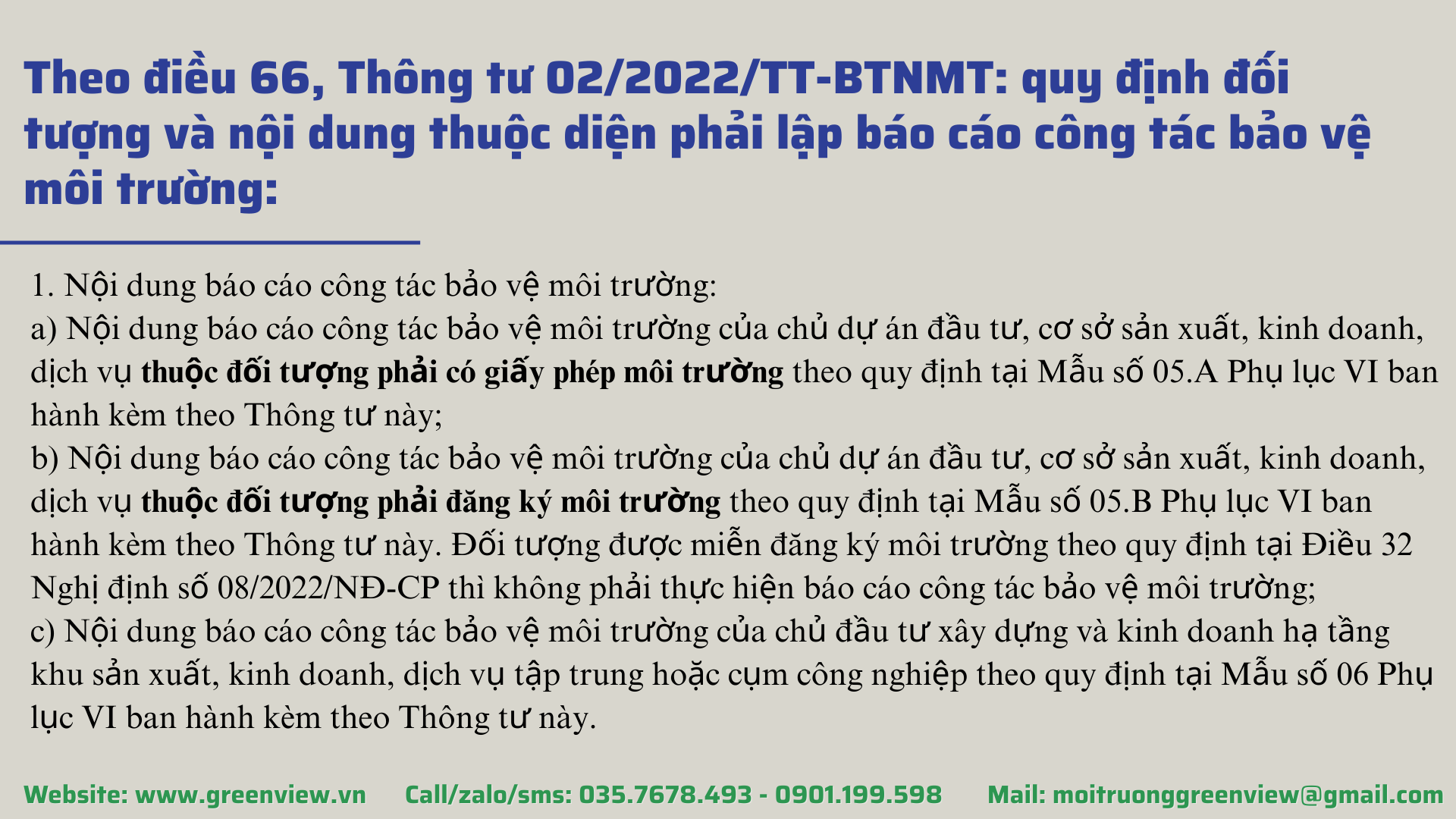 Lập báo cáo công tác bảo vệ môi trường định kỳ hàng năm (kỳ báo cáo tính từ ngày 01/01 đến hết ngày 31/12 của năm báo cáo) theo quy định tại Điều 119 Luật Bảo vệ môi trường, Điều 66 Thông tư số 02/2022/TT-BTNMT.