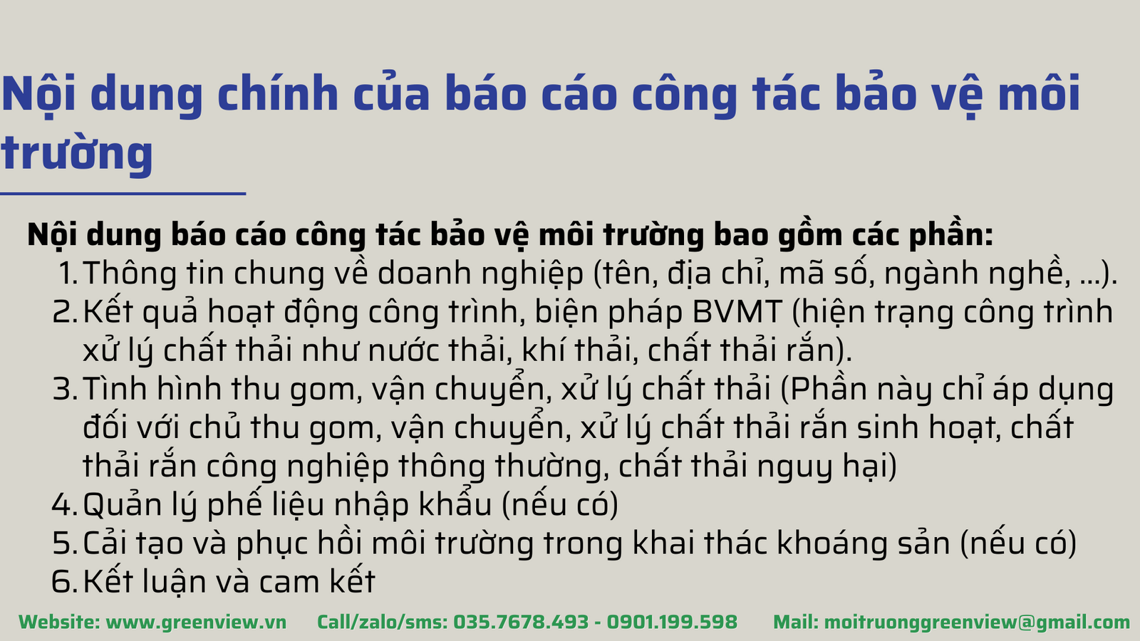 Báo cáo công tác bảo vệ môi trường là báo cáo định kỳ hằng năm mà Doanh nghiệp phải thực hiện để báo cáo đến cơ quan quản lý về tổng thể công tác bảo vệ môi trường tại cơ sở.