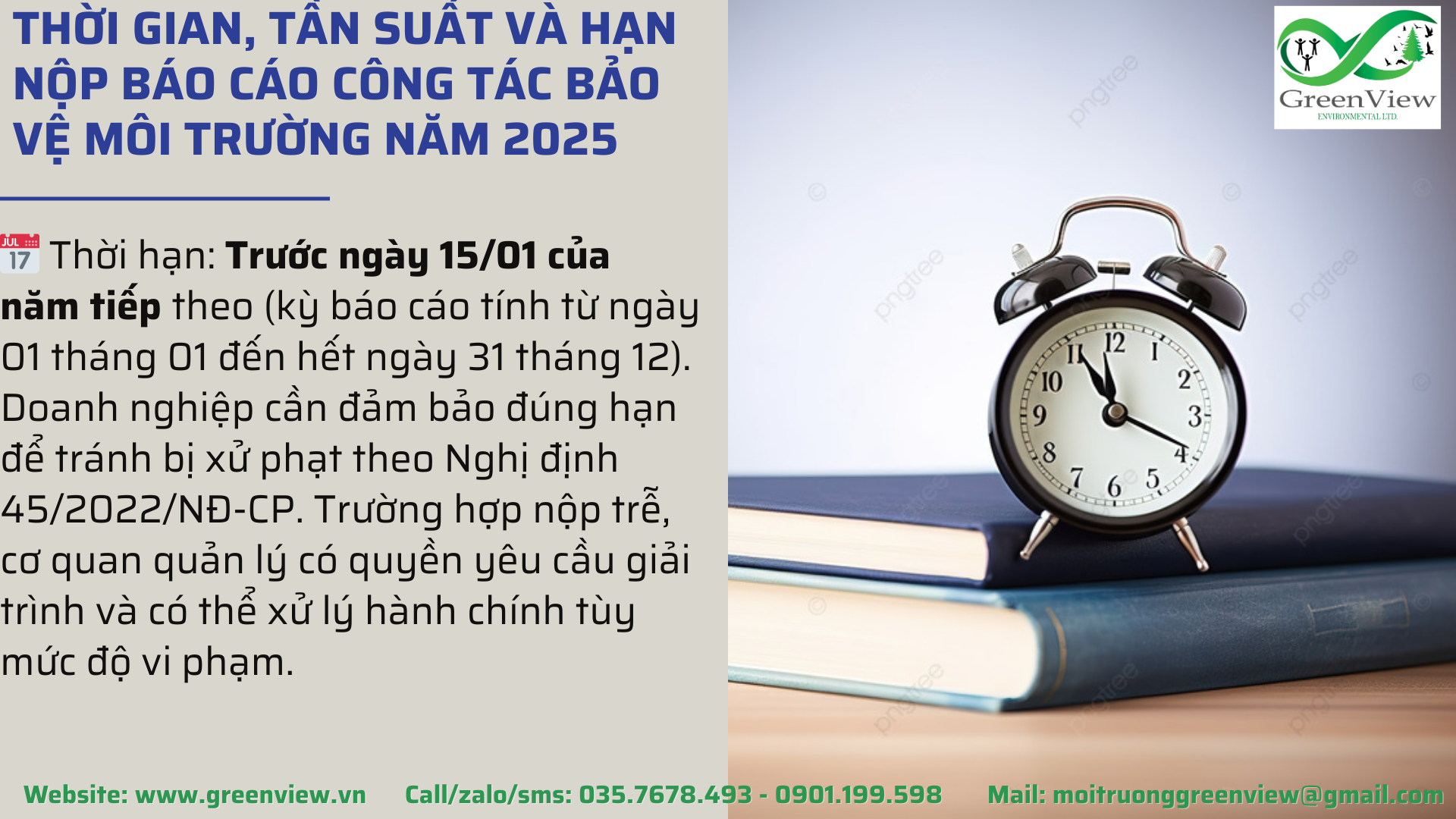 Việc lập báo cáo công tác bảo vệ môi trường được các cơ sở sản xuất, dự án đầu tư thực hiện định kỳ mỗi năm, sau khi đã hoàn tất các hạng mục liên quan như quan trắc môi trường định kỳ hoặc quan trắc tự động, liên tục theo quy định pháp luật. Toàn bộ kết quả quan trắc thu thập theo từng quý sẽ được tổng hợp, phân tích và đưa vào báo cáo công tác bảo vệ môi trường hằng năm (BC CTBVMT). Báo cáo này phải được chủ dự án gửi đến cơ quan quản lý nhà nước có thẩm quyền trong khoảng thời gian từ ngày 01/01 đến ngày 31/12 của cùng năm để phục vụ công tác giám sát và lưu trữ hồ sơ môi trường.