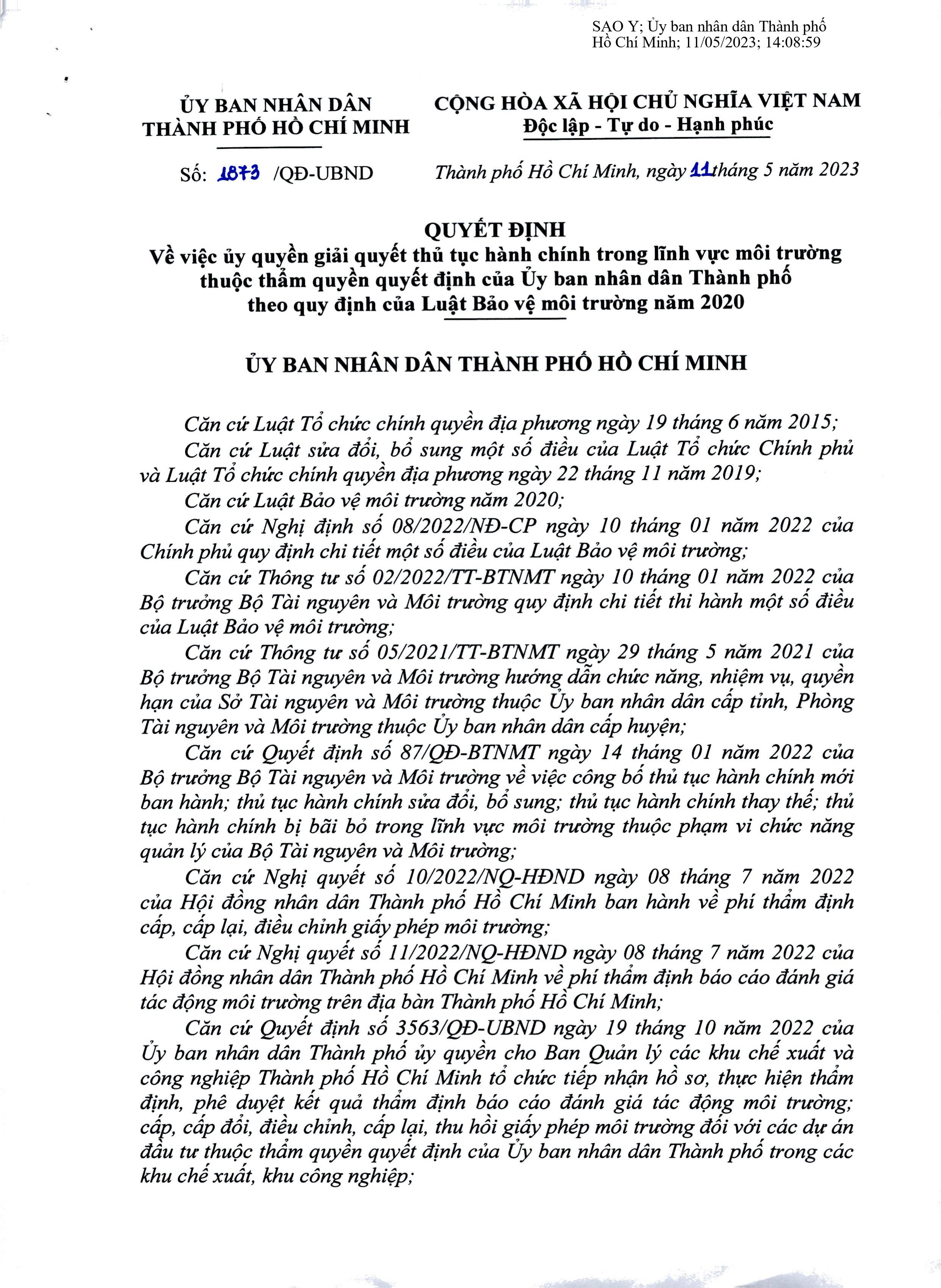 UBND TPHCM đã ban hành quyết định về việc ủy quyền giải quyết thủ tục hành chính trong lĩnh vực môi trường thuộc thẩm quyền quyết định của UBND TP theo quy định của Luật Bảo vệ môi trường năm 2020.
