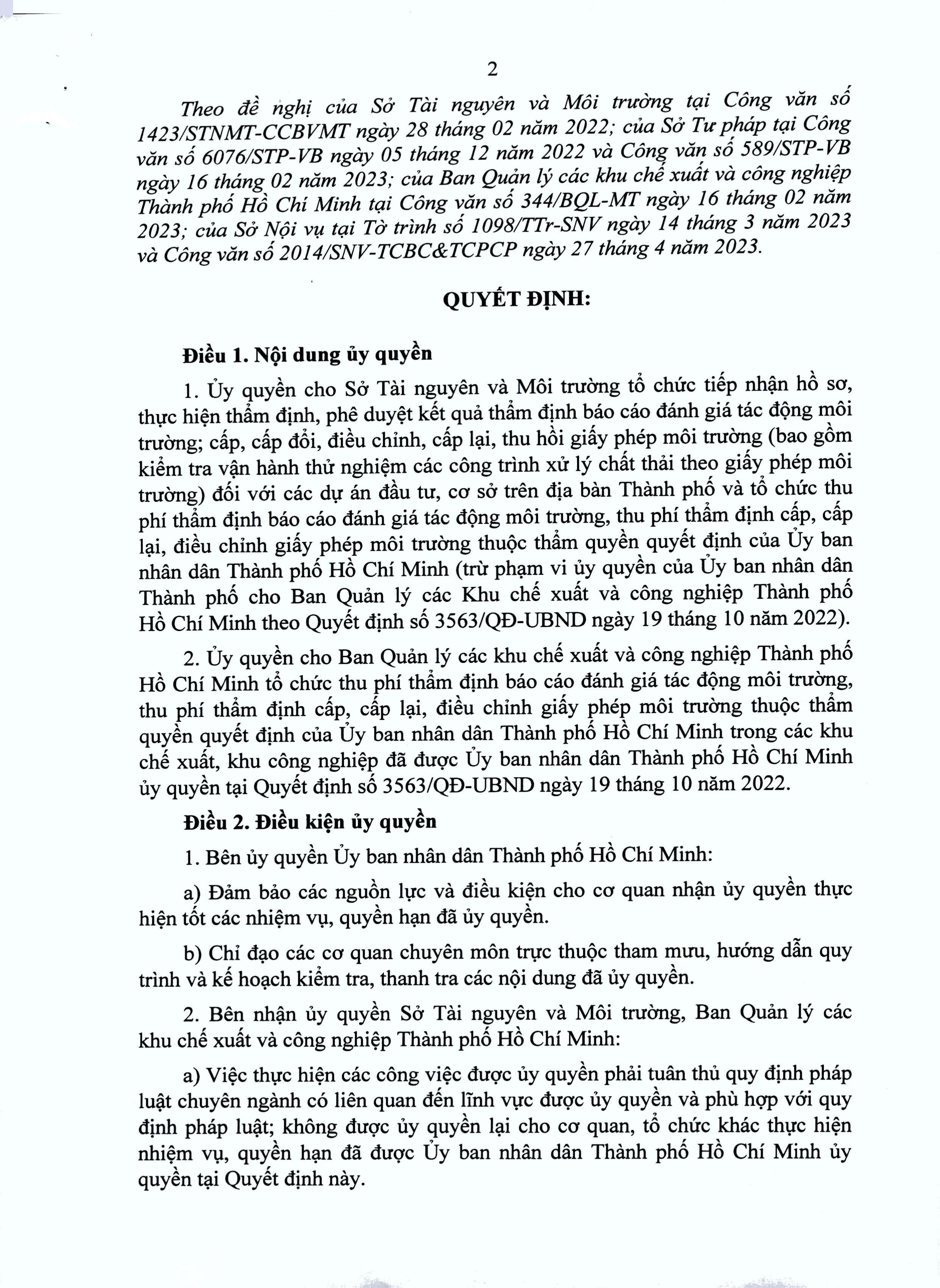 Ủy ban Nhân dân Thành phố Hồ Chí Minh ủy quyền cho Ban Quản lý các Khu chế xuất & khu công nghiệp TPHCM thực hiện tổ chức tiếp nhận hồ sơ, thực hiện thẩm định, phê duyệt kết quả báo cáo đánh giá tác động môi trường, cấp, cấp đổi, điều chỉnh, cấp lại giấy phép môi trường đối với các dự án đầu tư thuộc thẩm quyền quyết định của Ủy ban nhân dân Thành phố trong các khu chế xuất, công nghiệp